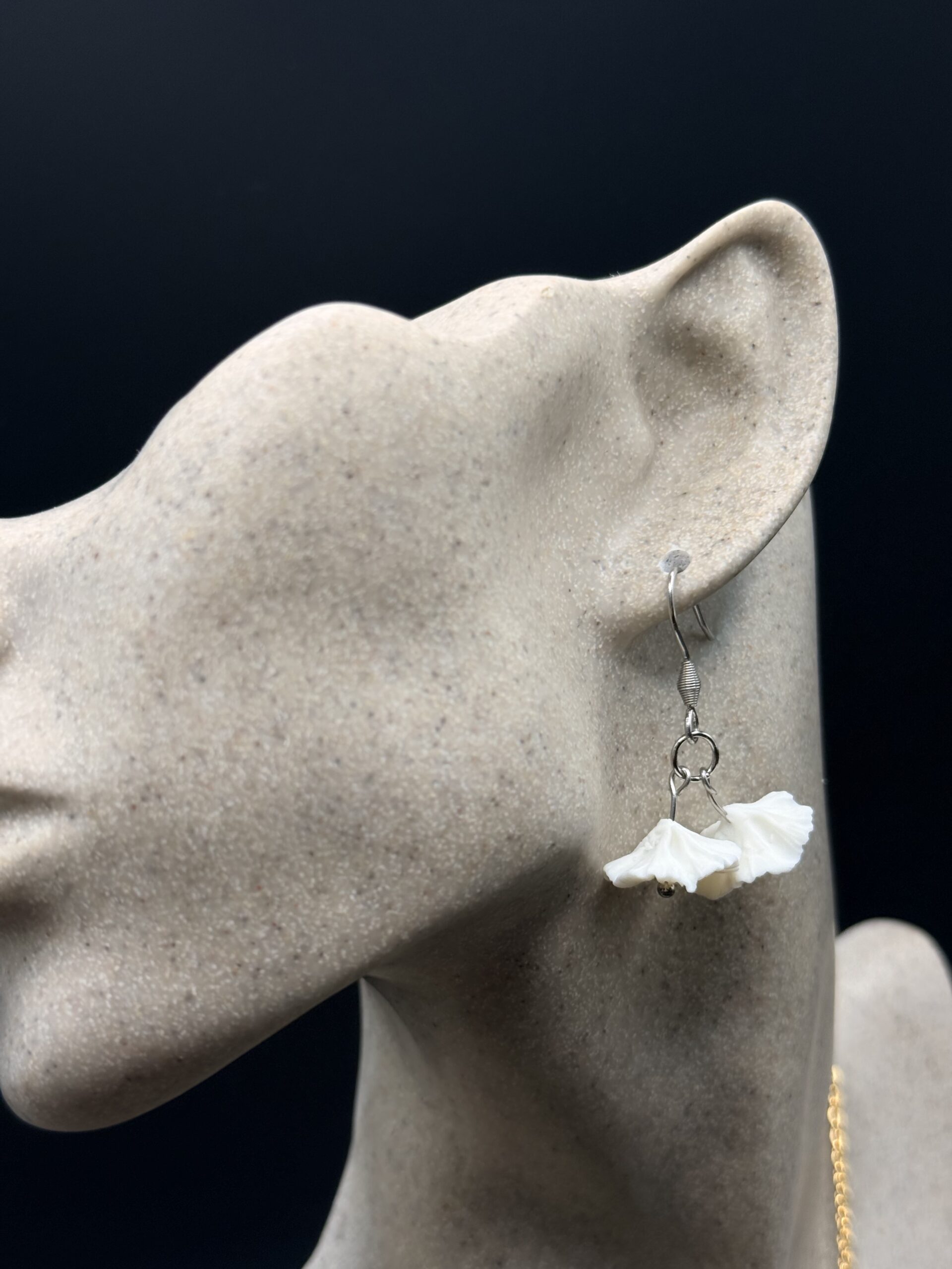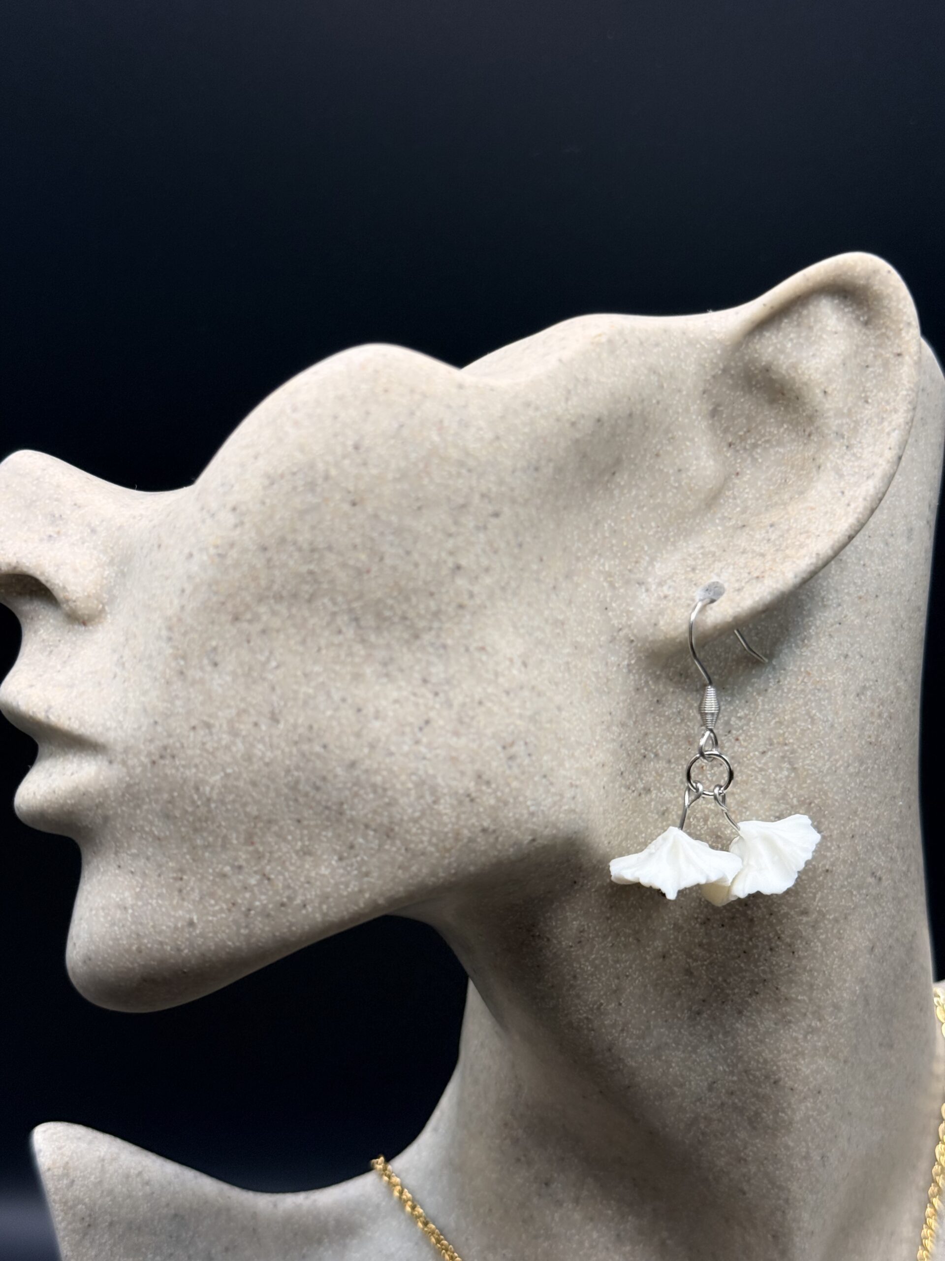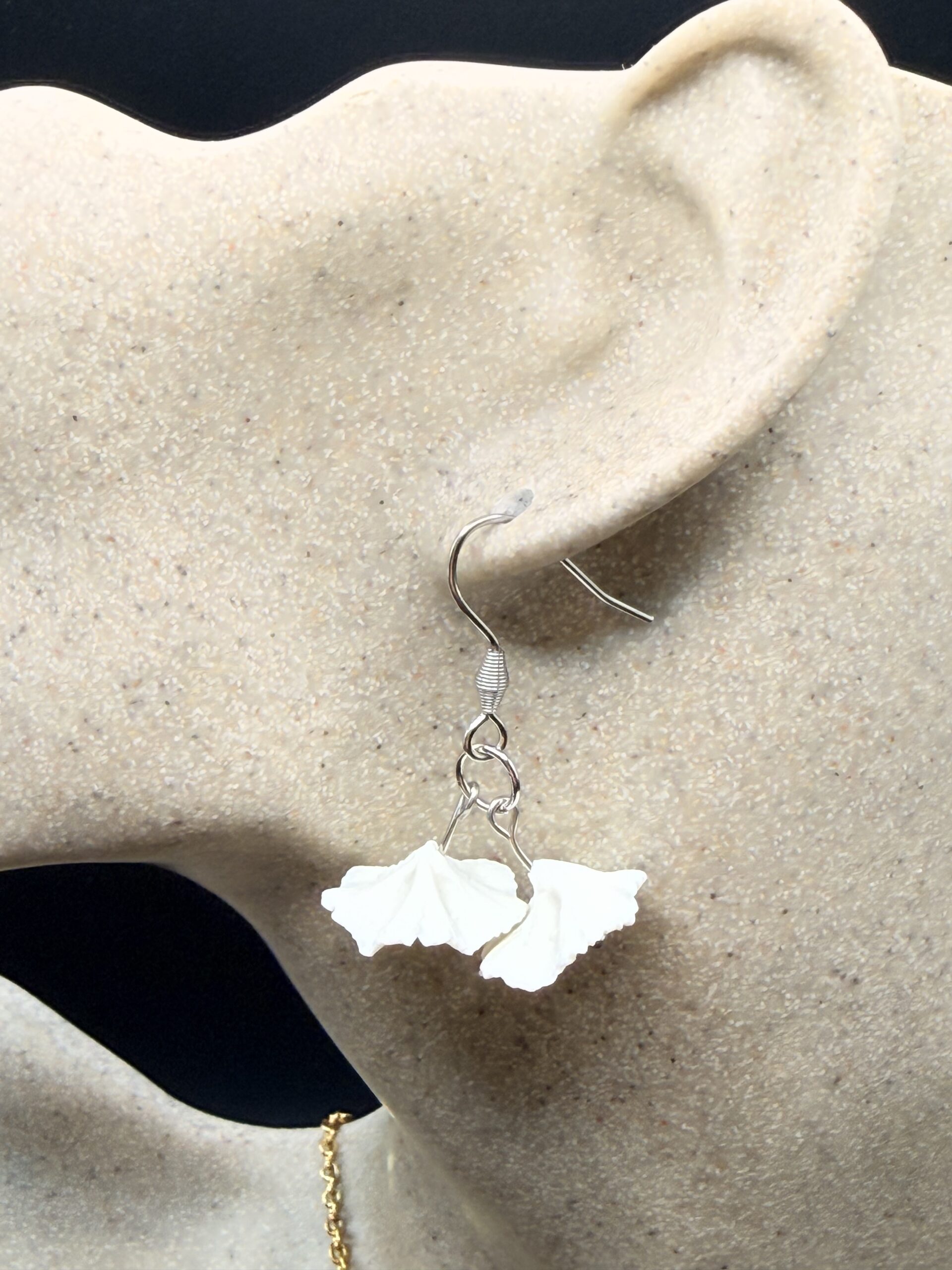 Ses deux petites fleurs en porcelaine froide, modelées entièrement à la main. Leurs pétales finement travaillés offrent un relief subtil et organique, comme deux fleurs fraîchement écloses. En leur cœur, une touche argentée vient capter délicatement la lumière et illuminer votre visage.