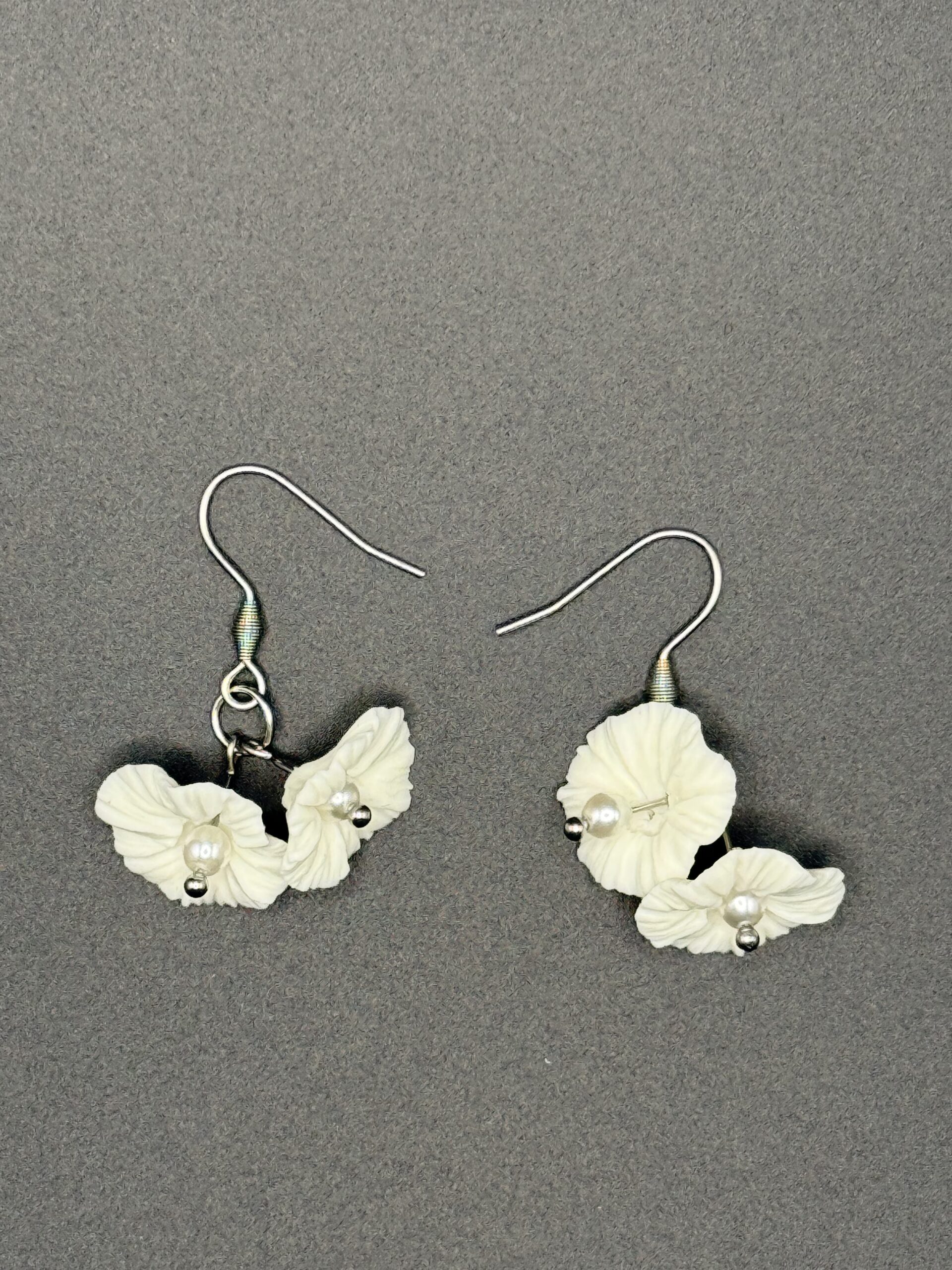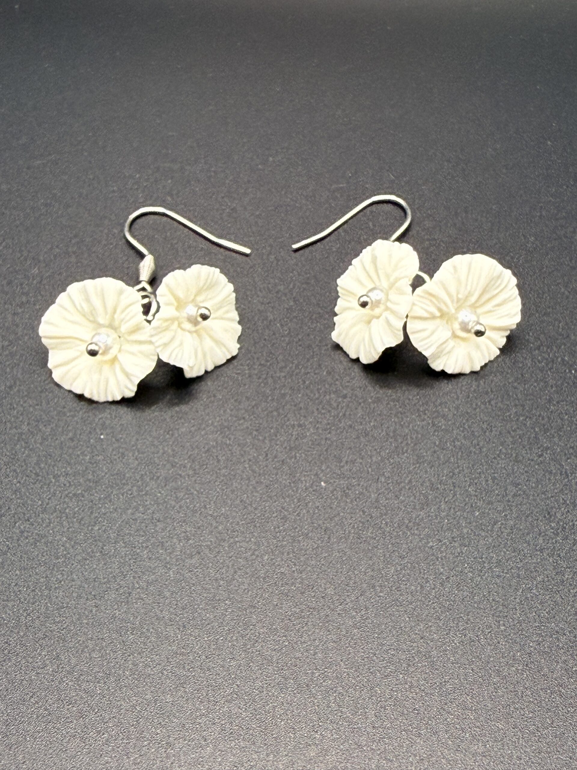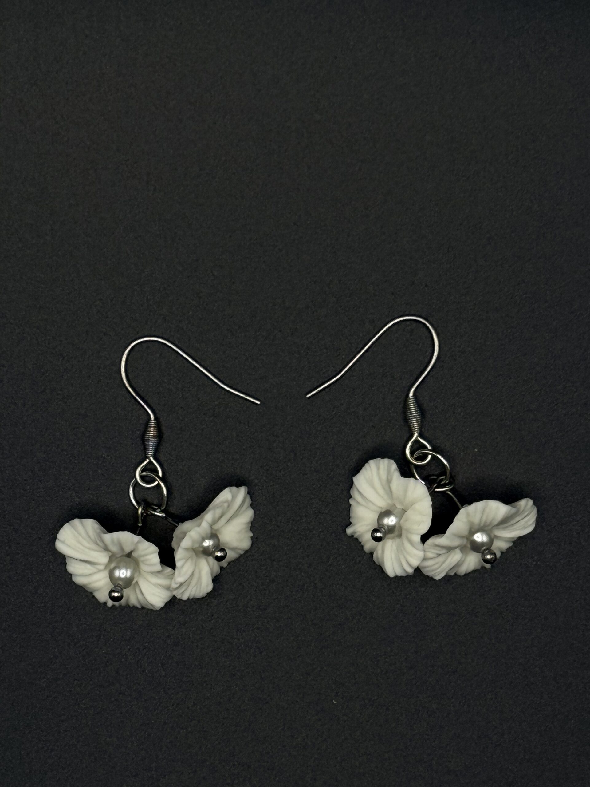 Ses deux petites fleurs en porcelaine froide, modelées entièrement à la main. Leurs pétales finement travaillés offrent un relief subtil et organique, comme deux fleurs fraîchement écloses. En leur cœur, une touche argentée vient capter délicatement la lumière et illuminer votre visage.