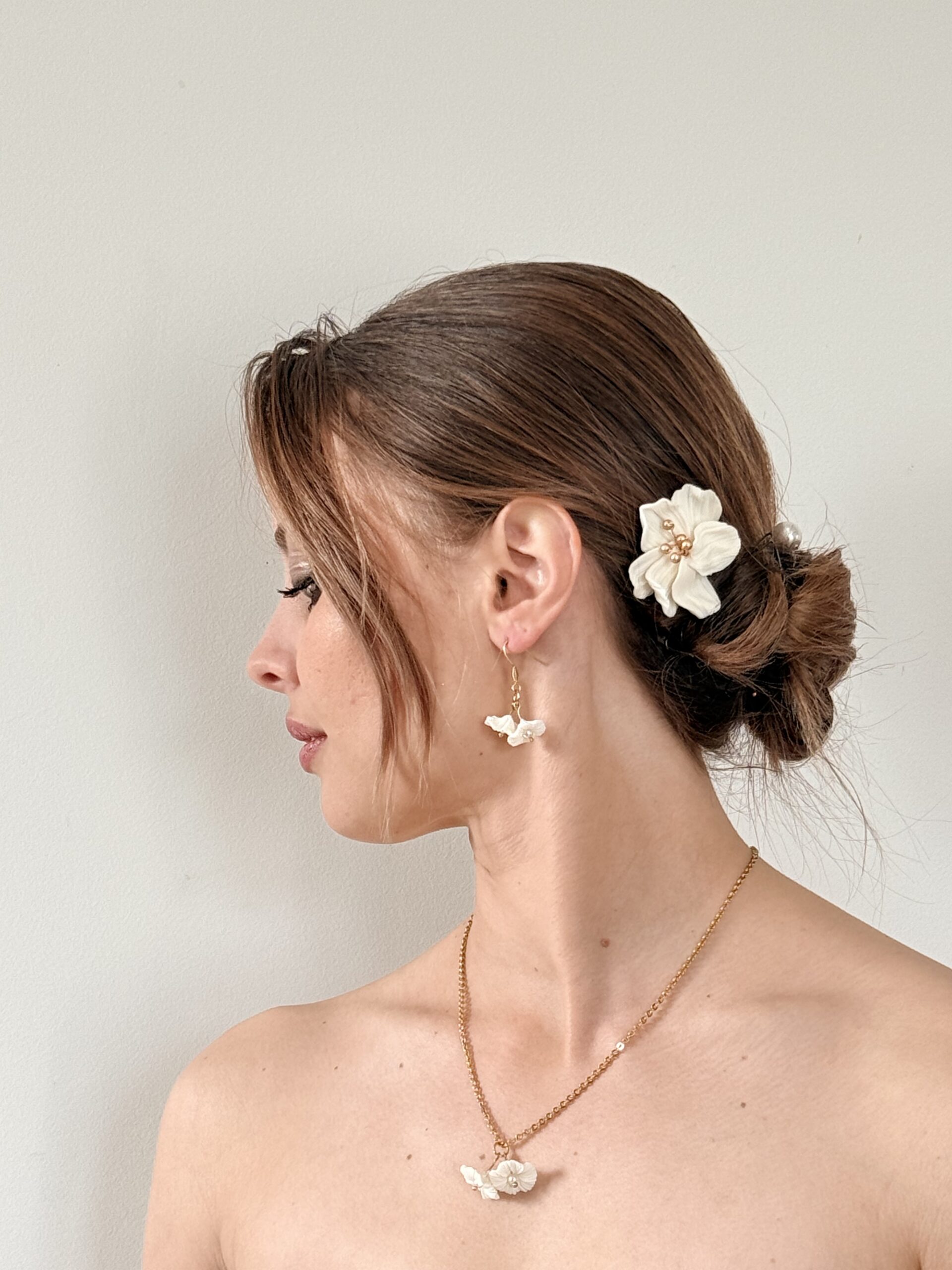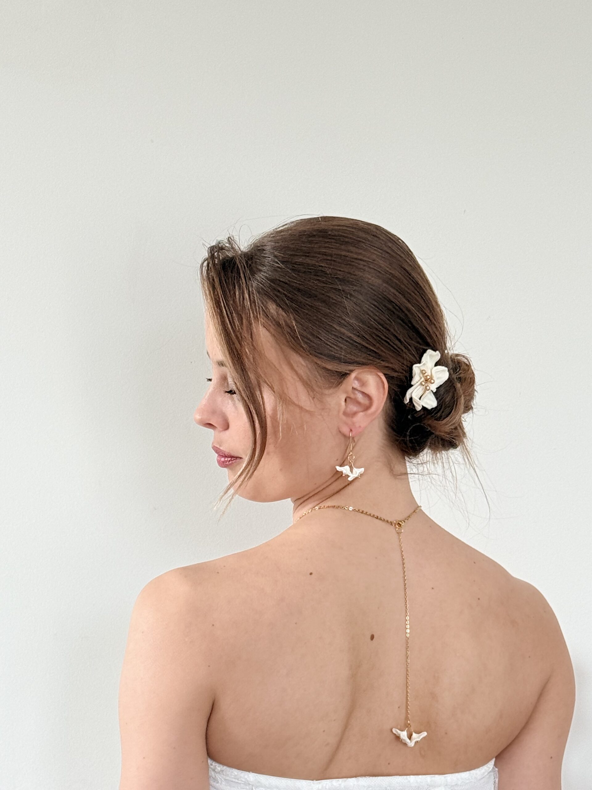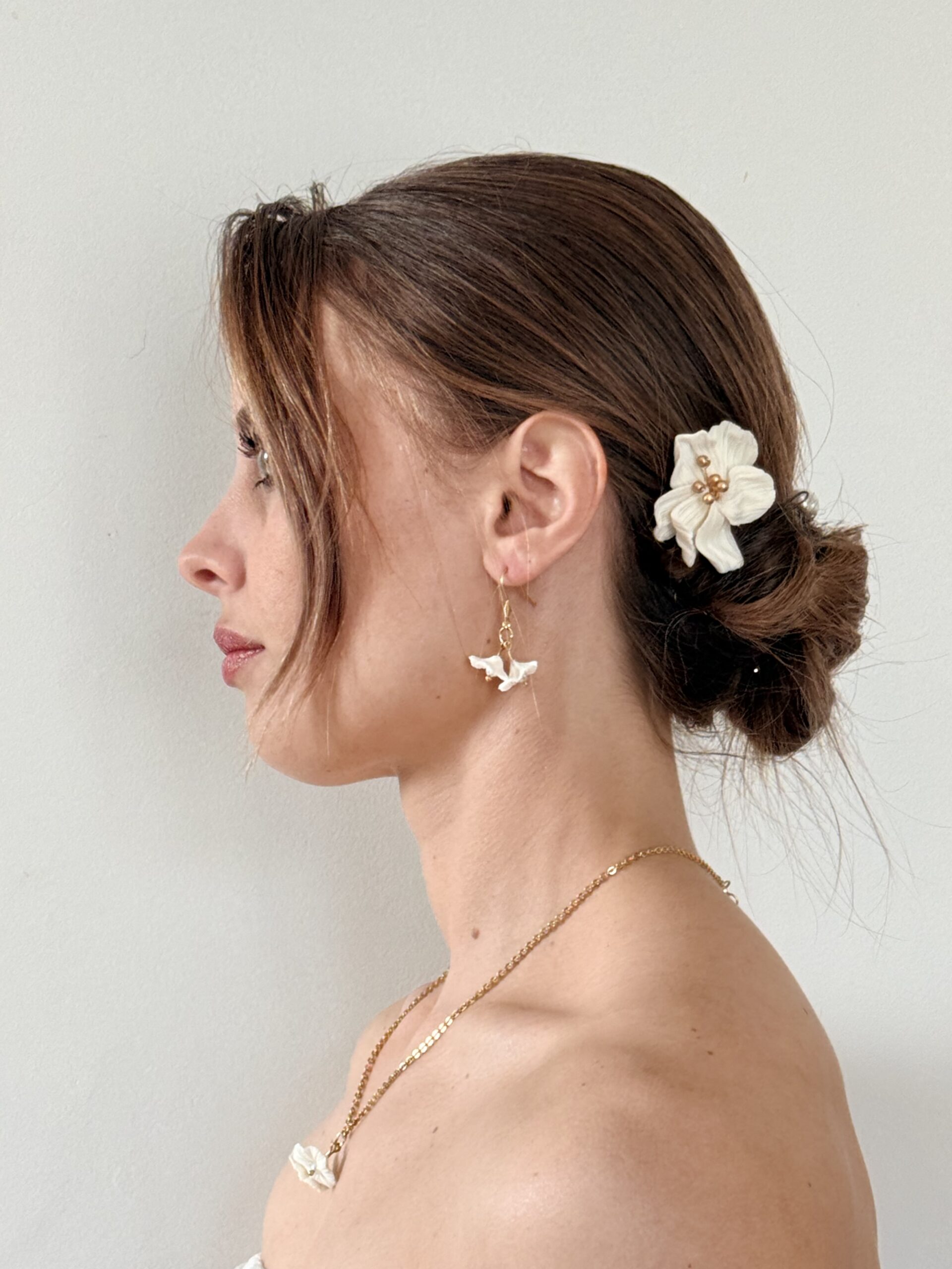 Ses deux petites fleurs en porcelaine froide, modelées entièrement à la main. Leurs pétales finement travaillés offrent un relief subtil et organique, comme deux fleurs fraîchement écloses. En leur cœur, une touche dorée vient capter délicatement la lumière et illuminer le décolleté.