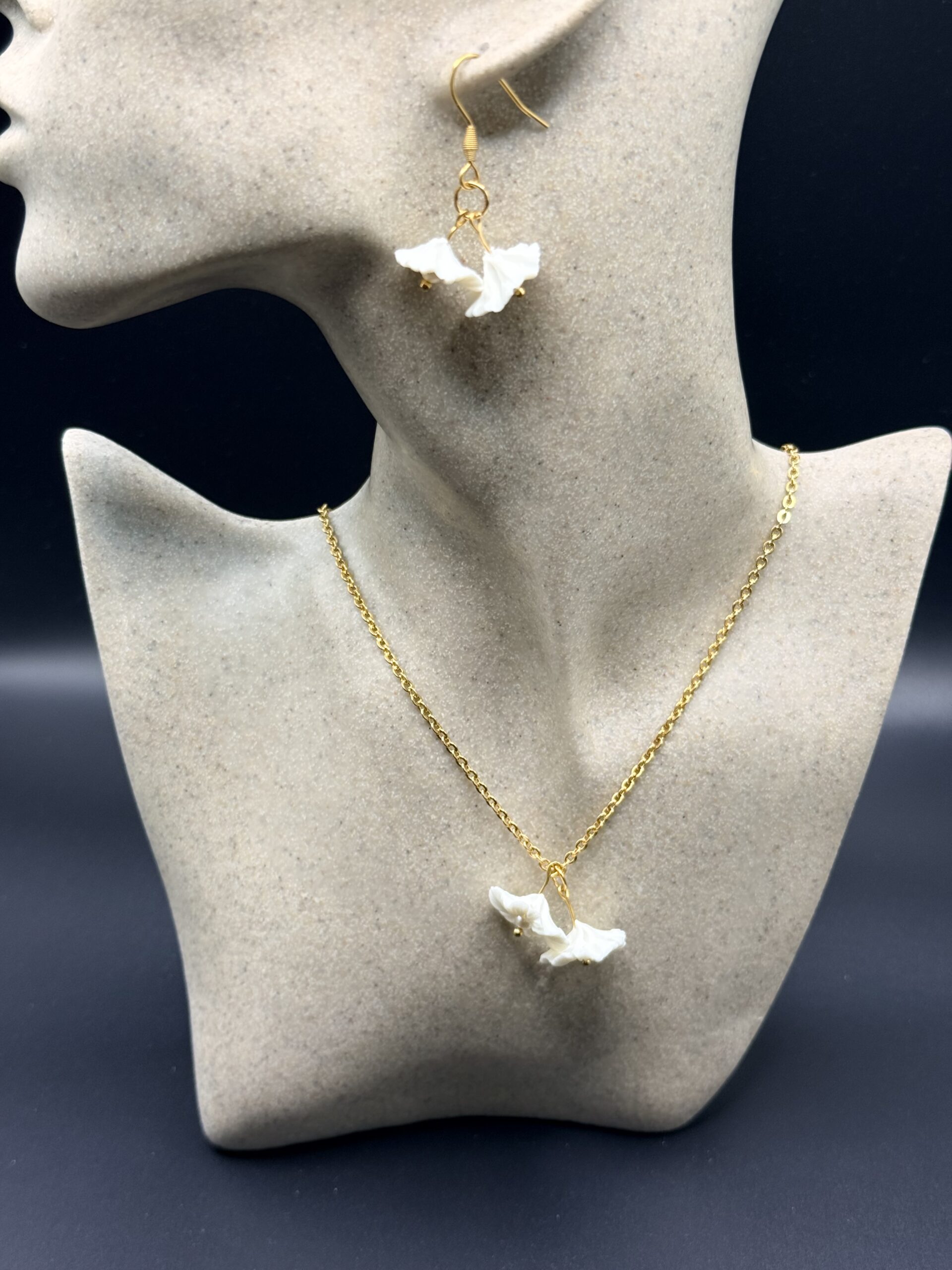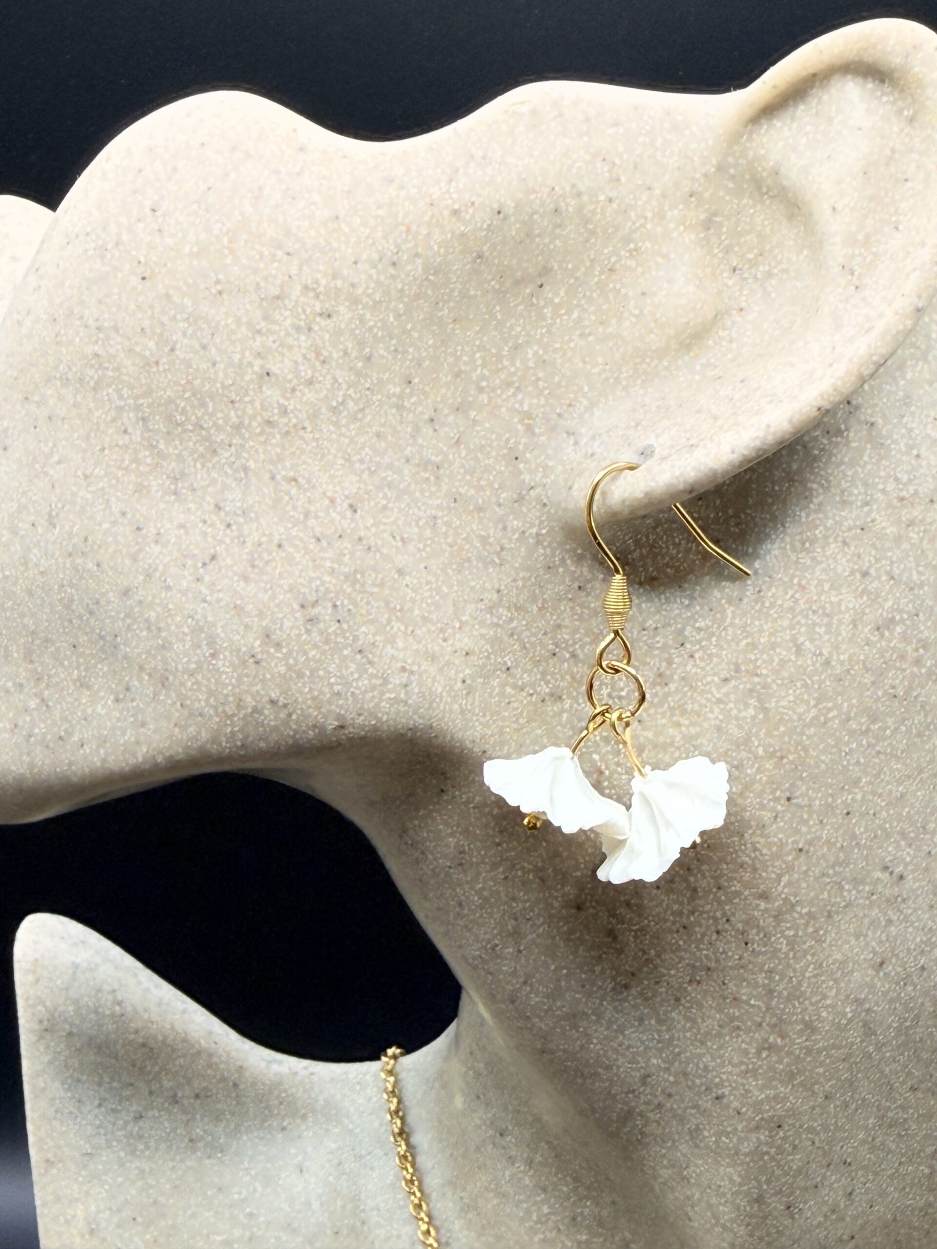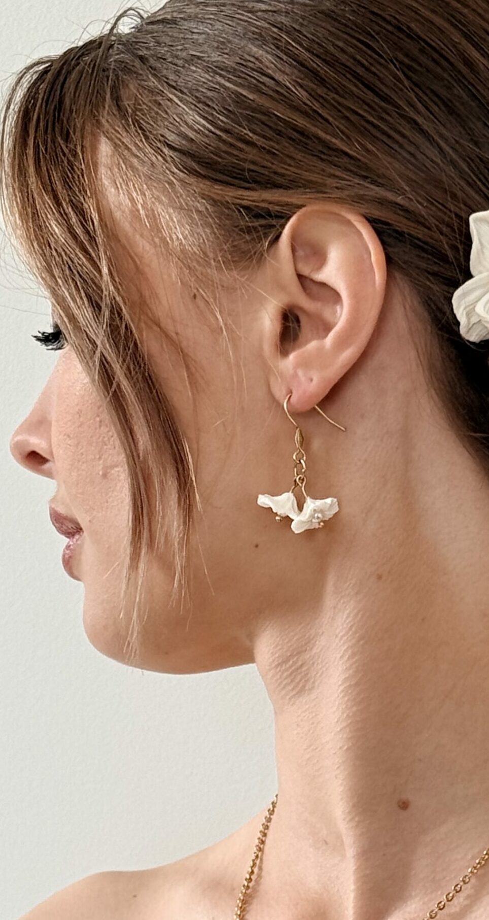 Ses deux petites fleurs en porcelaine froide, modelées entièrement à la main. Leurs pétales finement travaillés offrent un relief subtil et organique, comme deux fleurs fraîchement écloses. En leur cœur, une touche dorée vient capter délicatement la lumière et illuminer le décolleté.