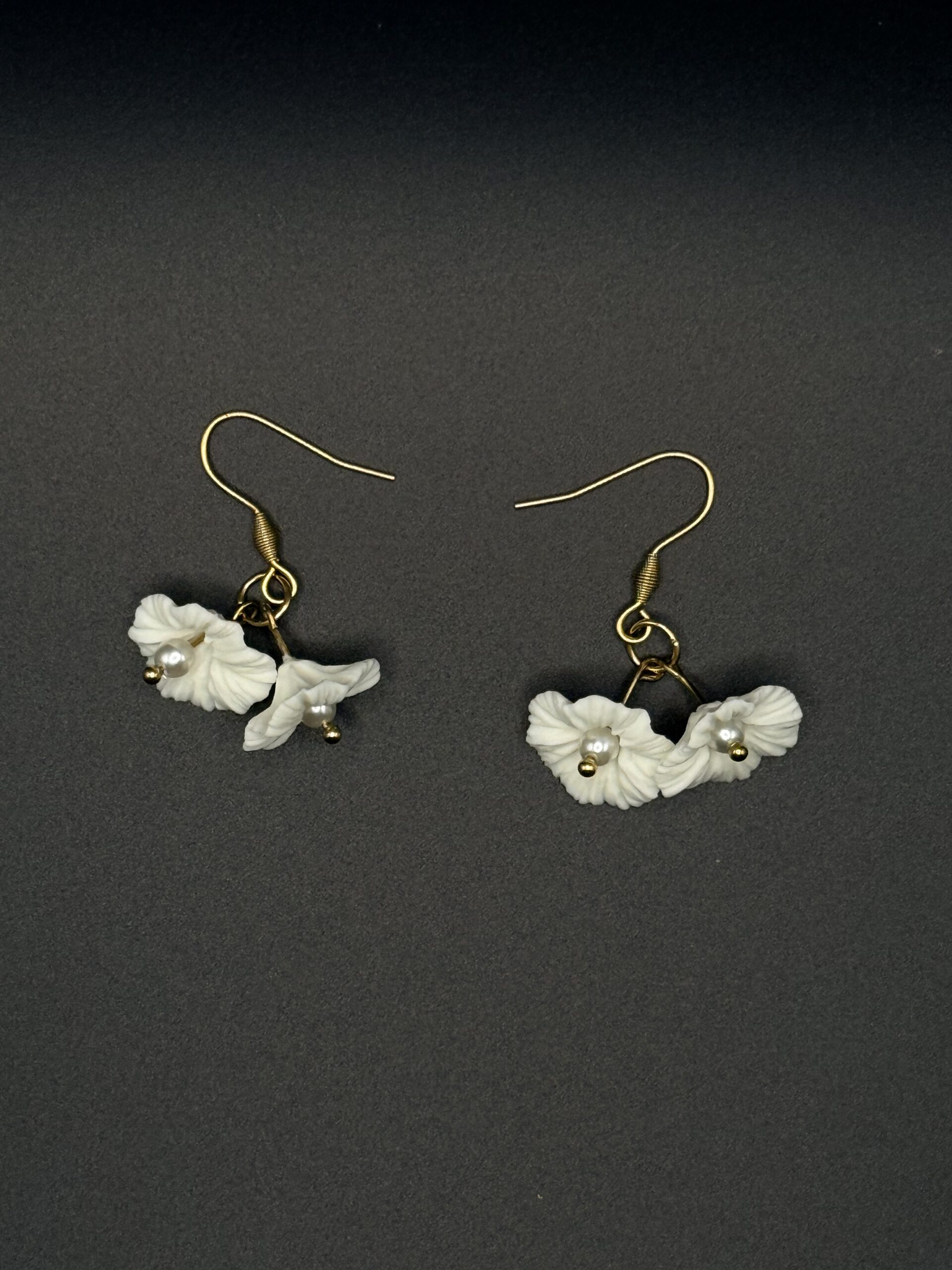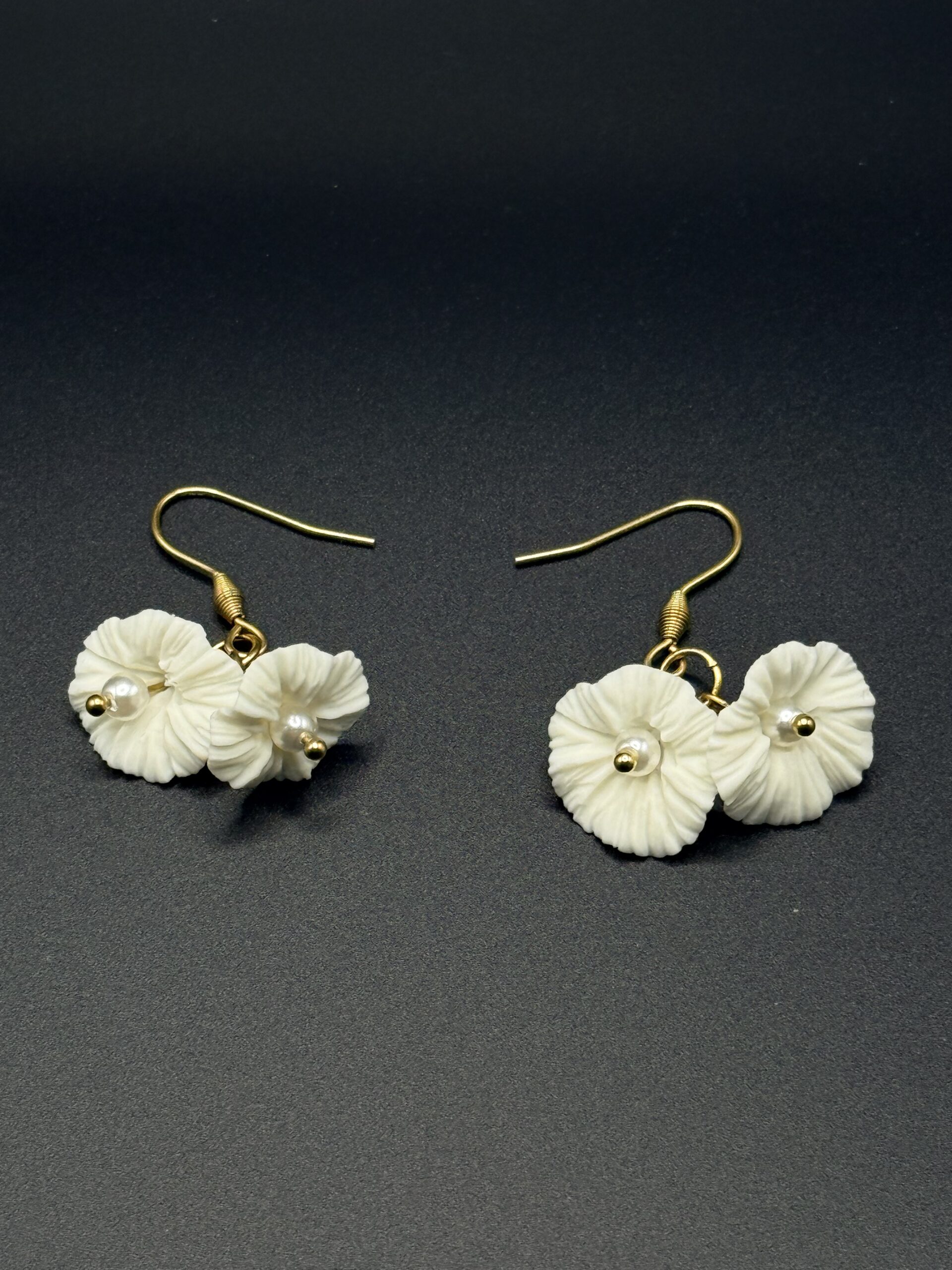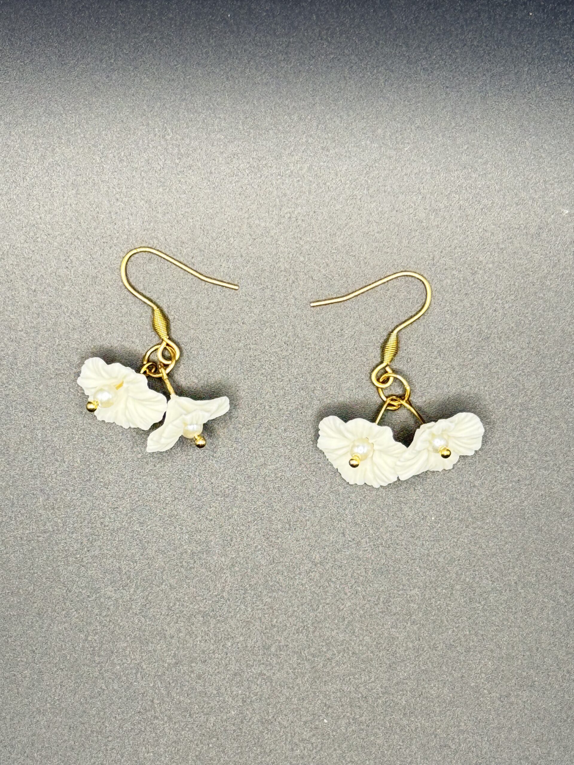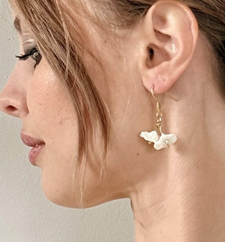 BOUCLES FLORÉLIA acier inoxydable doré, fleurs en porcelaine froide et perle en verre.