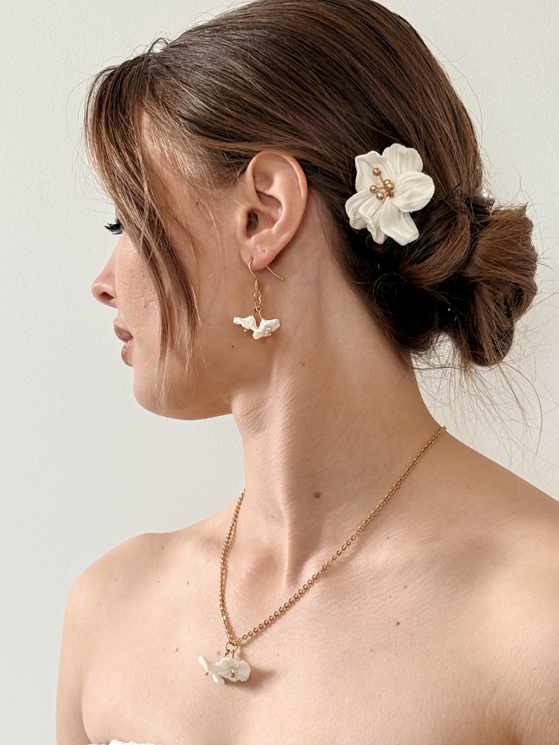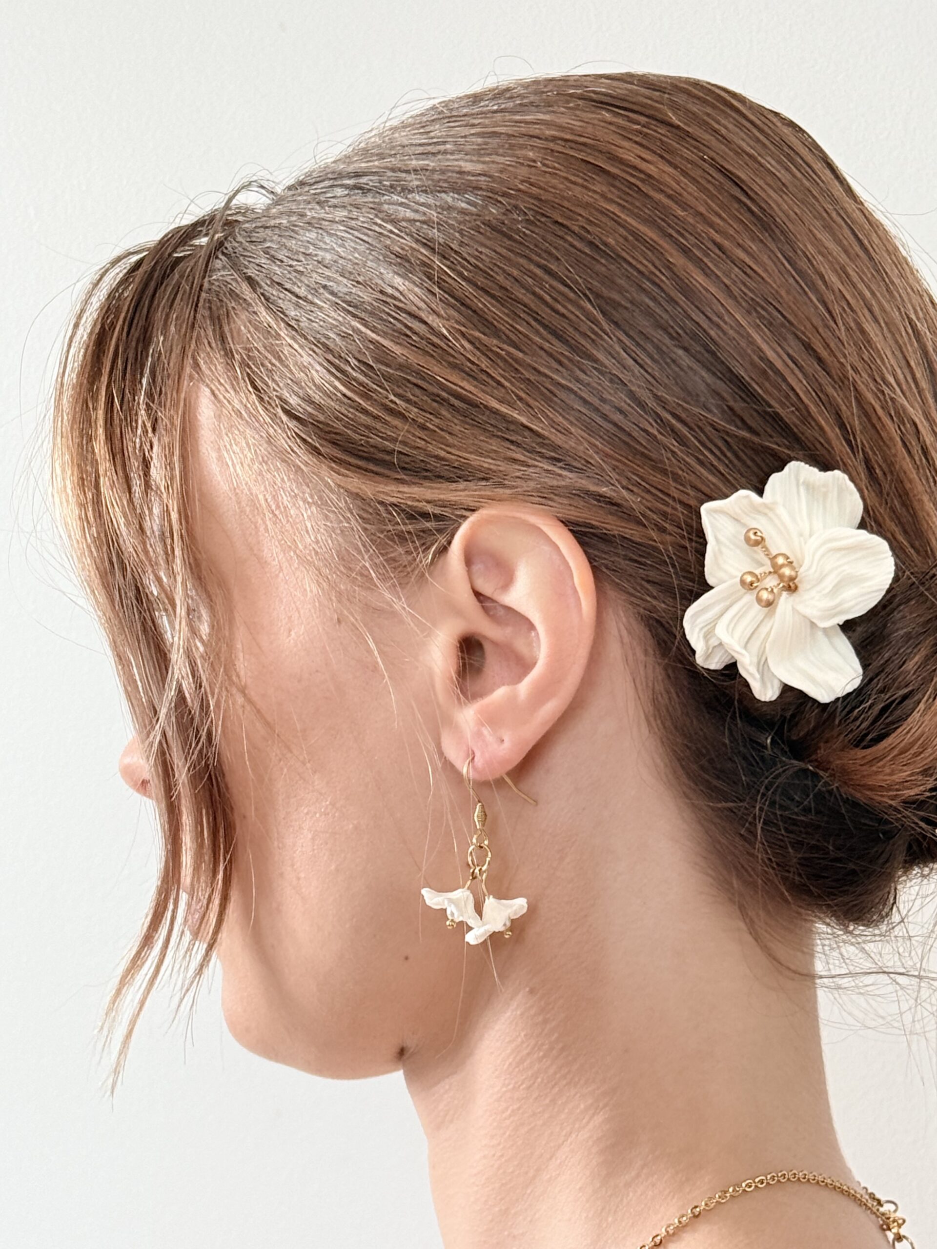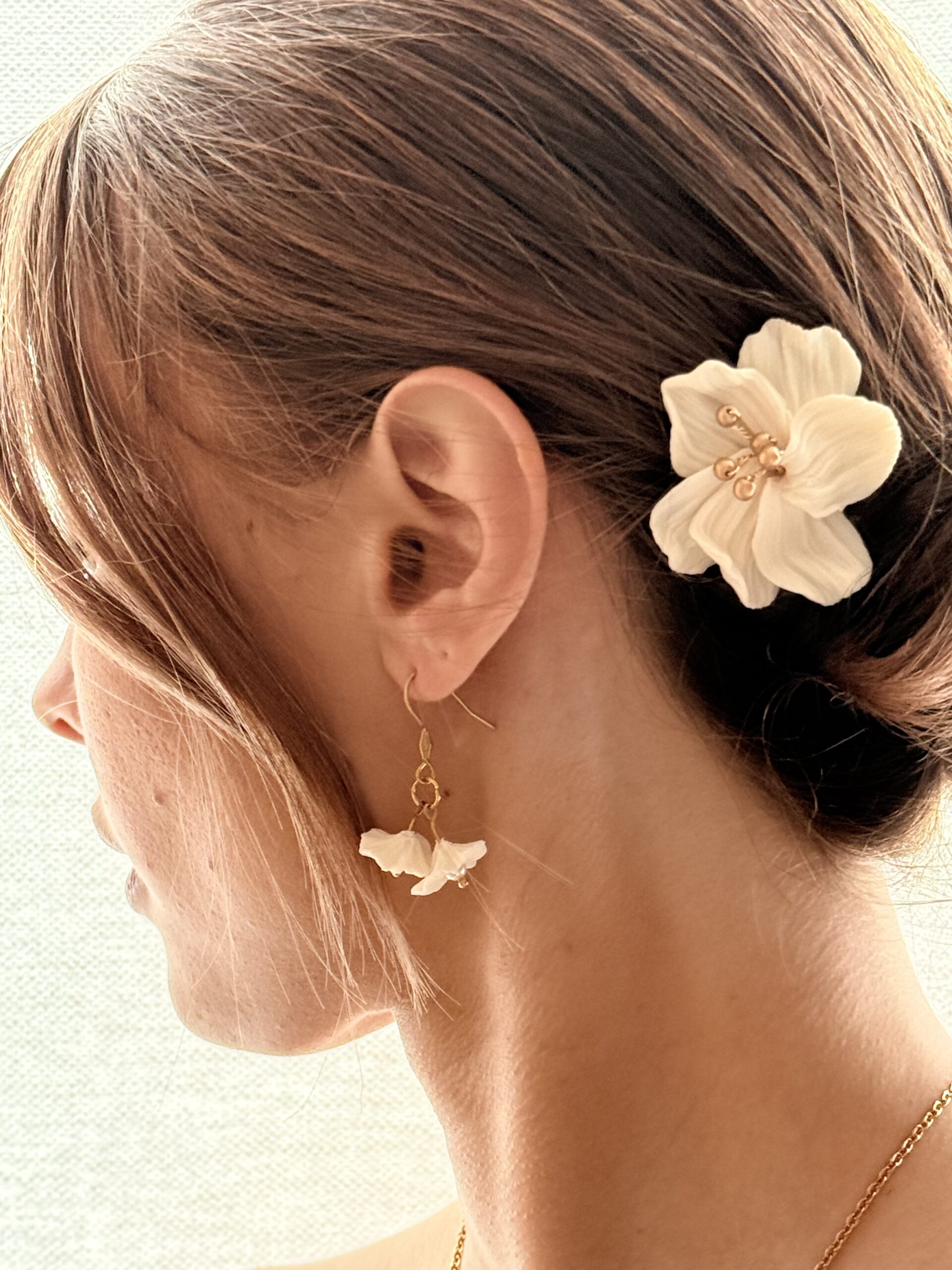 Romantique et lumineux, les boucles FLORÉLIA célèbrent la douceur et l’élégance naturelle de la mariée