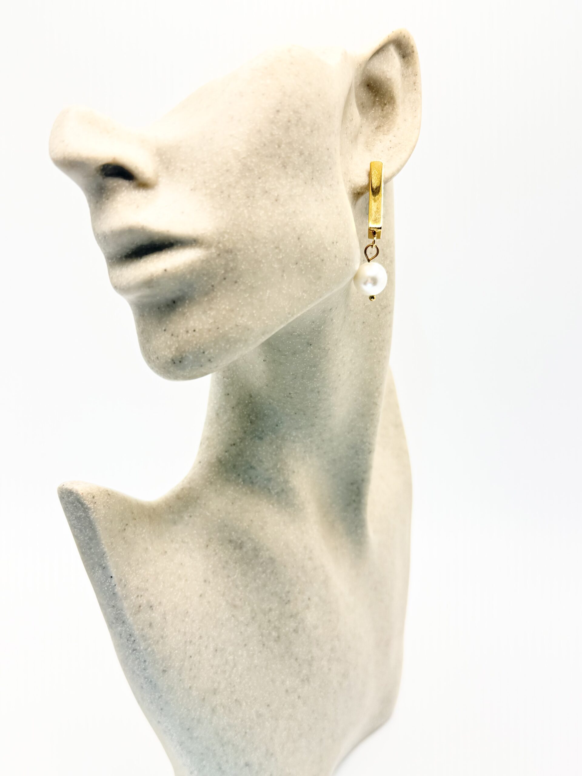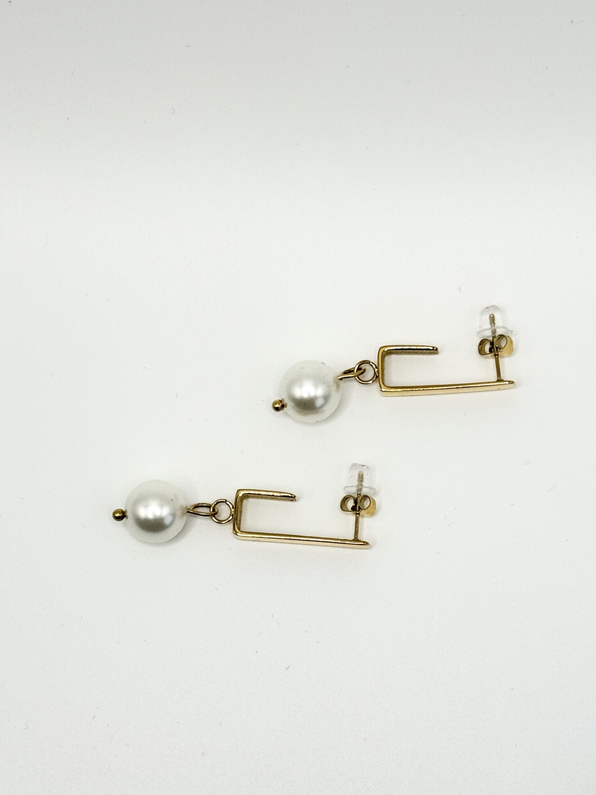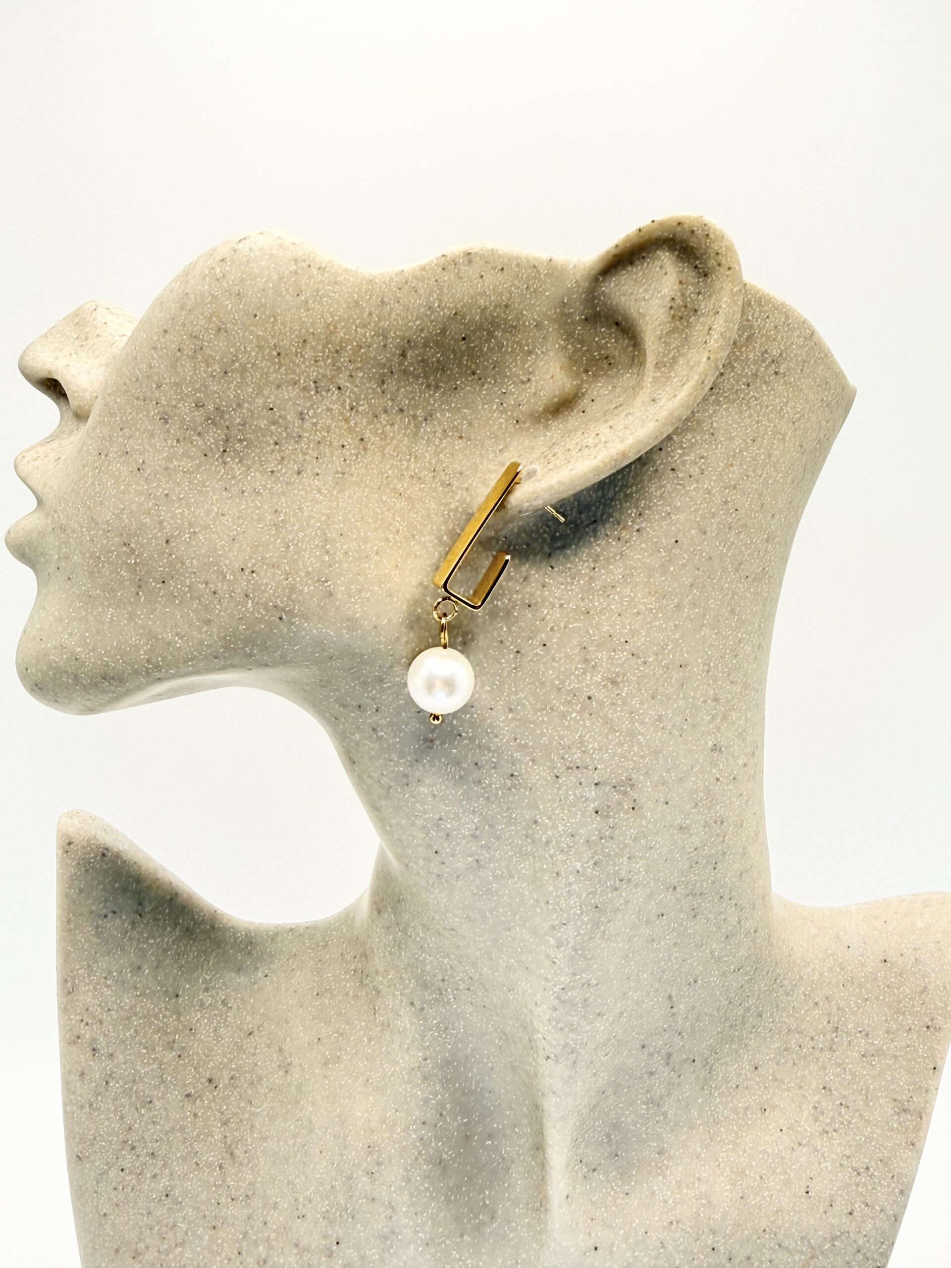 Nos boucles NINA DORÉ rectangle sont en acier inoxydable doré orné d’une perle en verre nacrée.