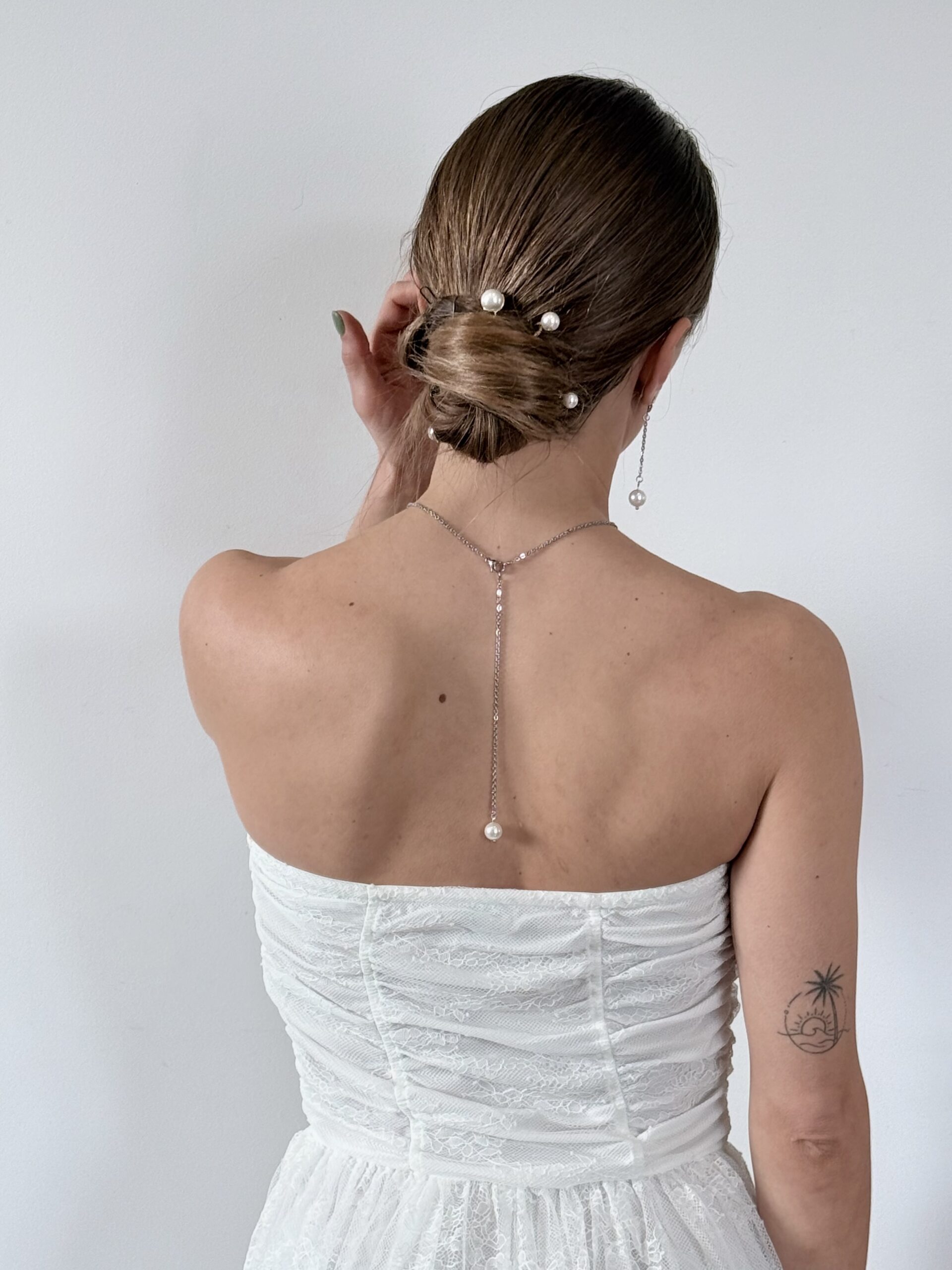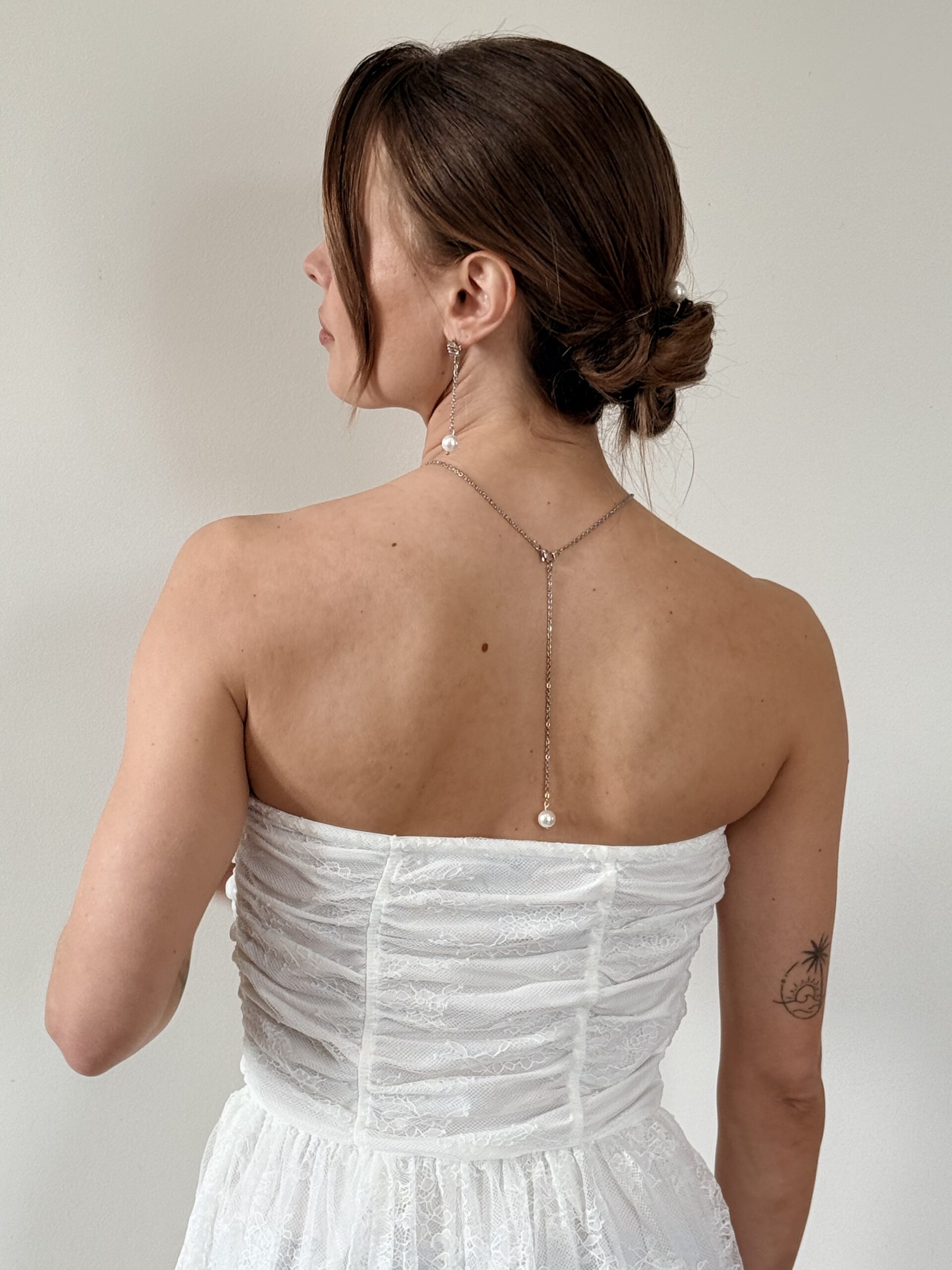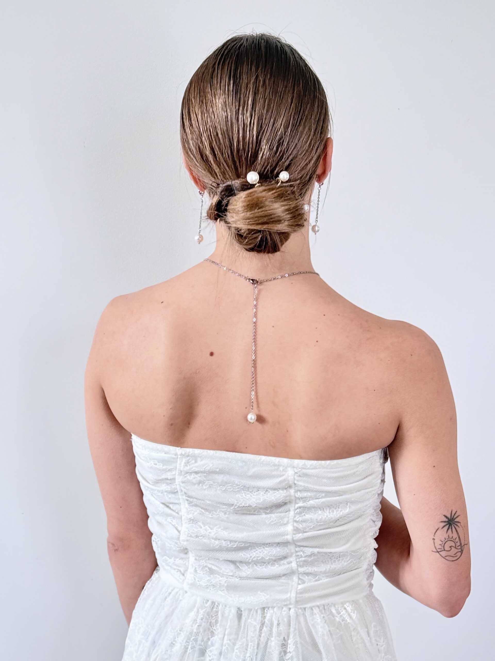 Sa chaine de dos est amovible et s’accroche tout simplement dans le fermoir du collier. Vous pourrez sublimer vos décolletés dans le dos ou porter uniquement le collier.