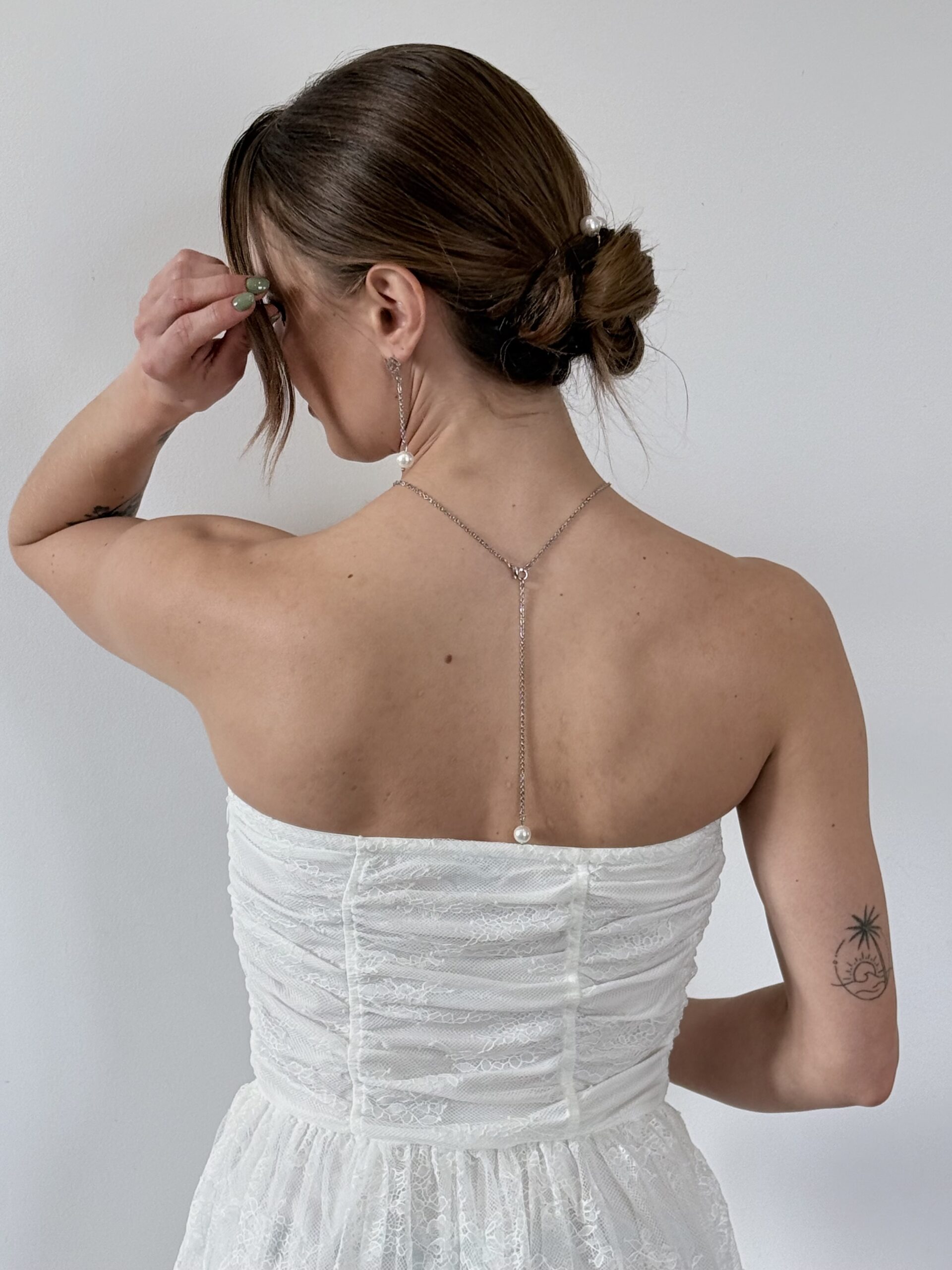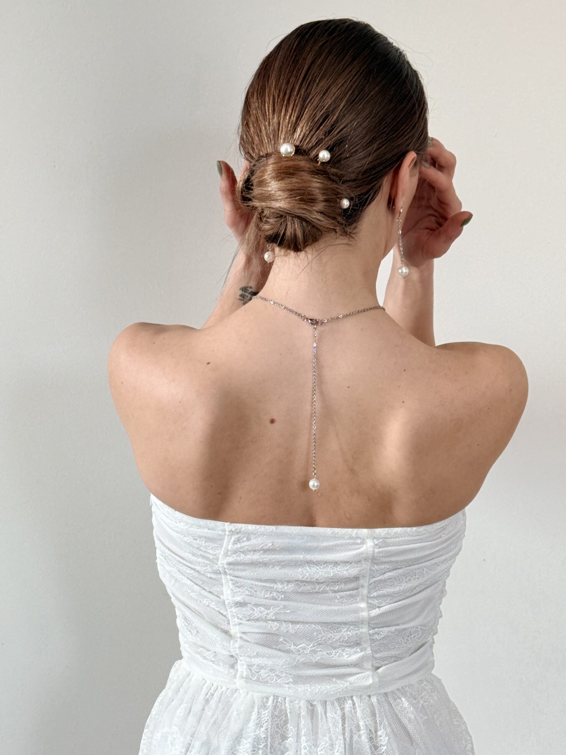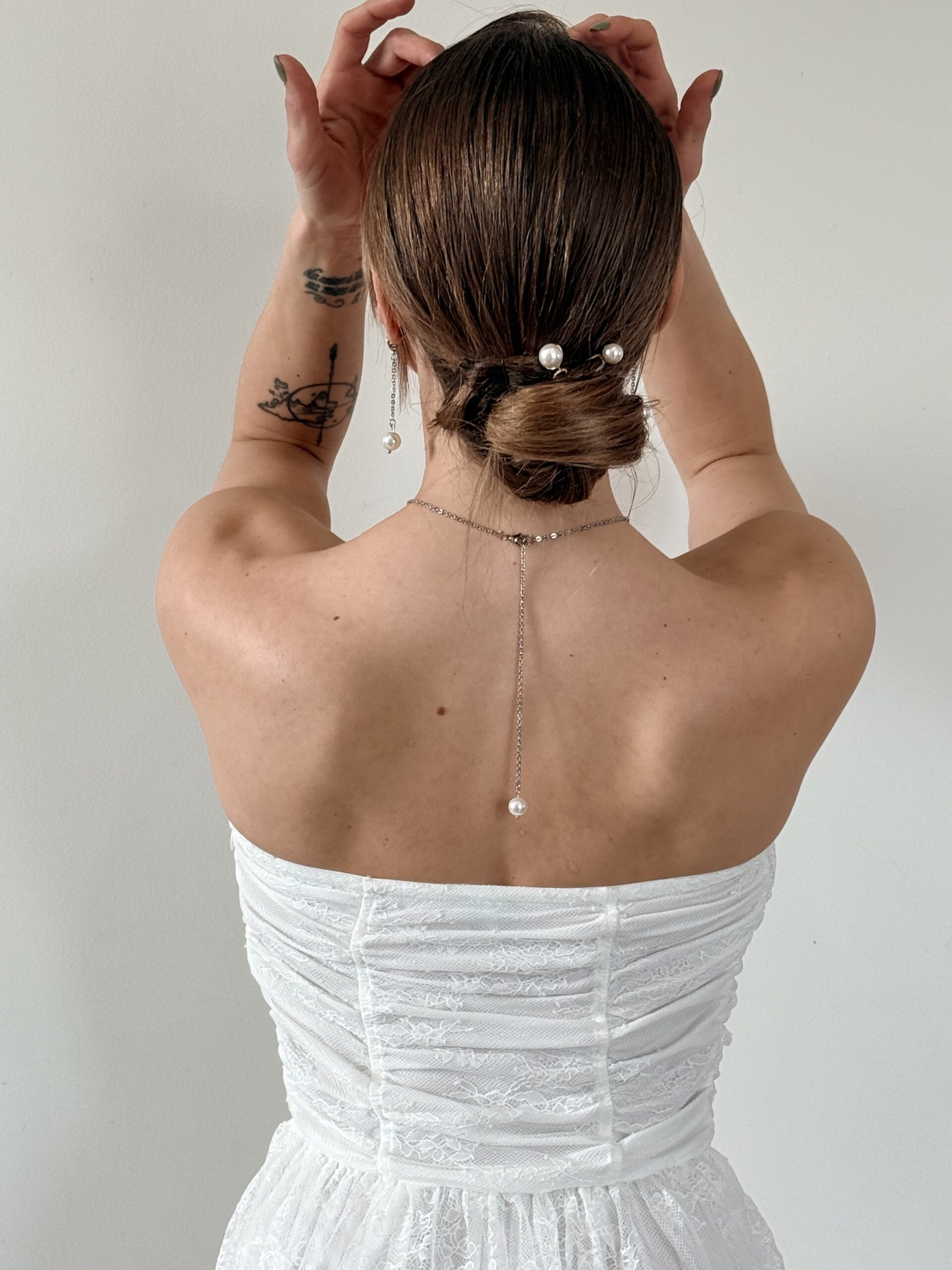 Sa chaine de dos est amovible et s’accroche tout simplement dans le fermoir du collier. Vous pourrez sublimer vos décolletés dans le dos ou porter uniquement le collier.