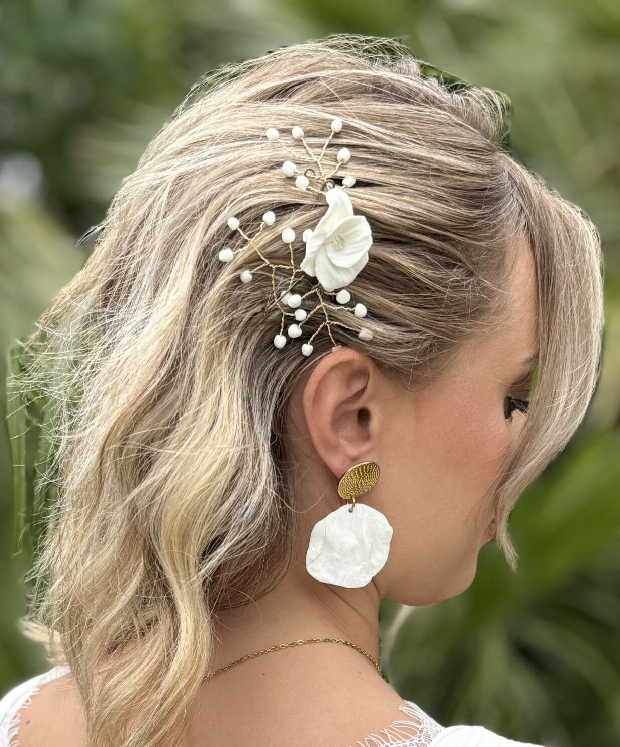 Collier BIANCA avec une chaine de dos amovible en acier inoxydable doré et fleur en porcelaine froide.