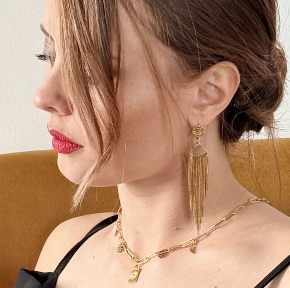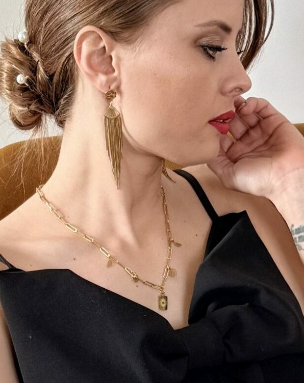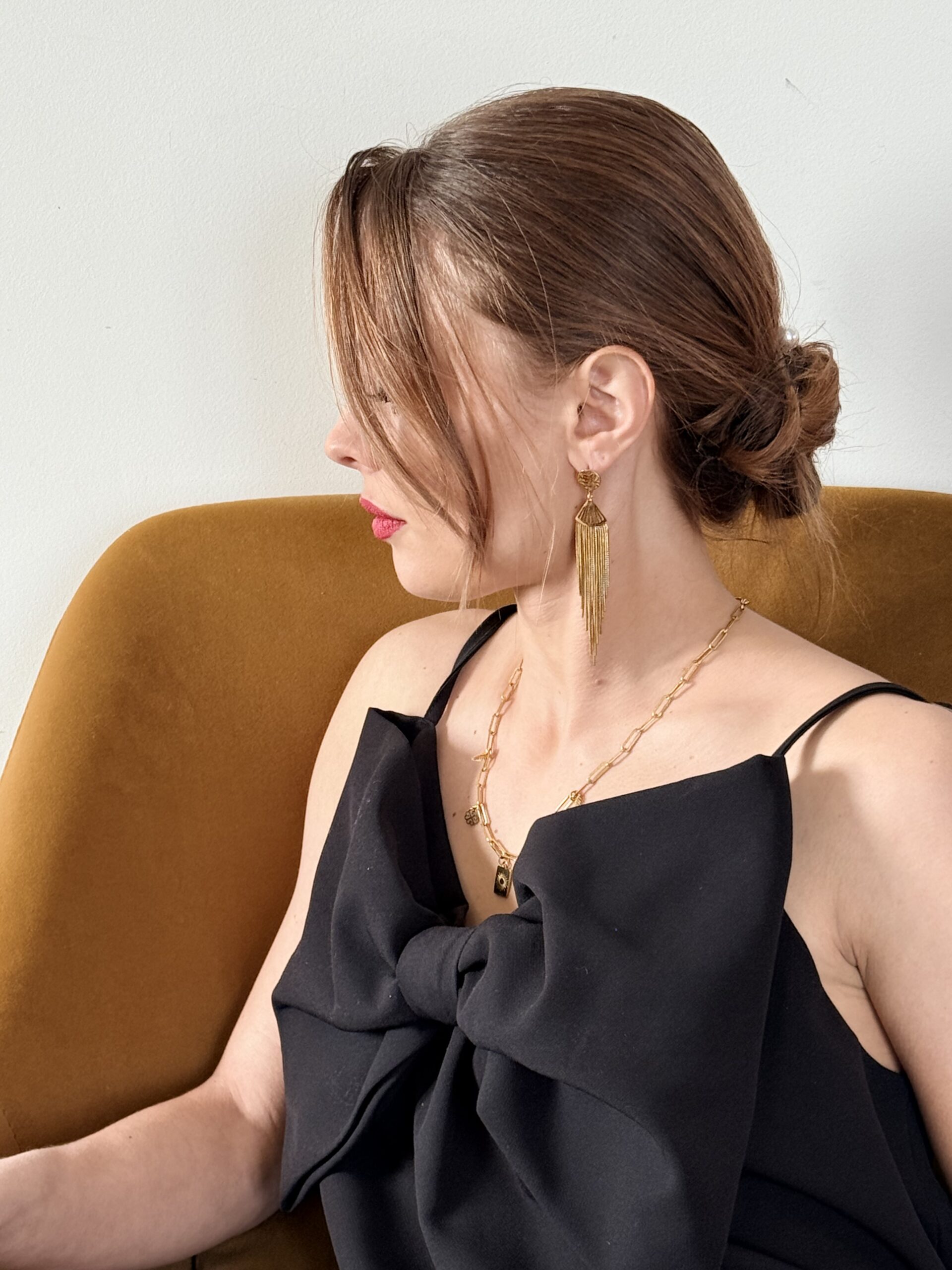 Le collier SOLEANE capte la lumière comme un souffle doré sur la peau.
