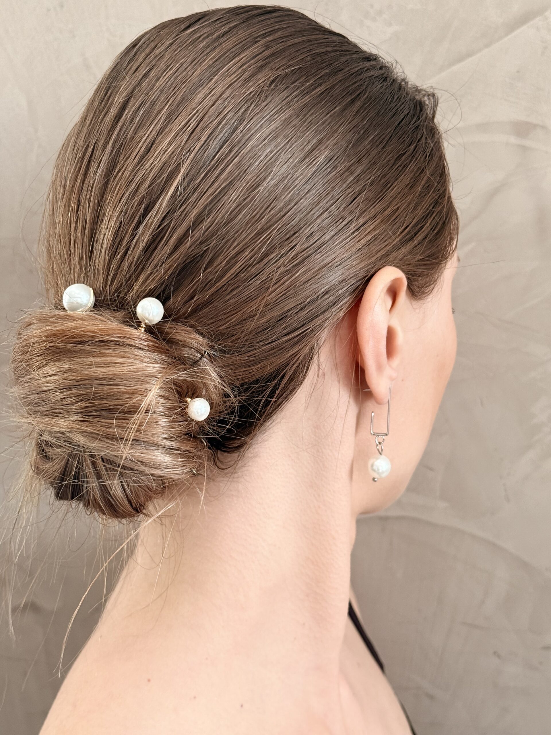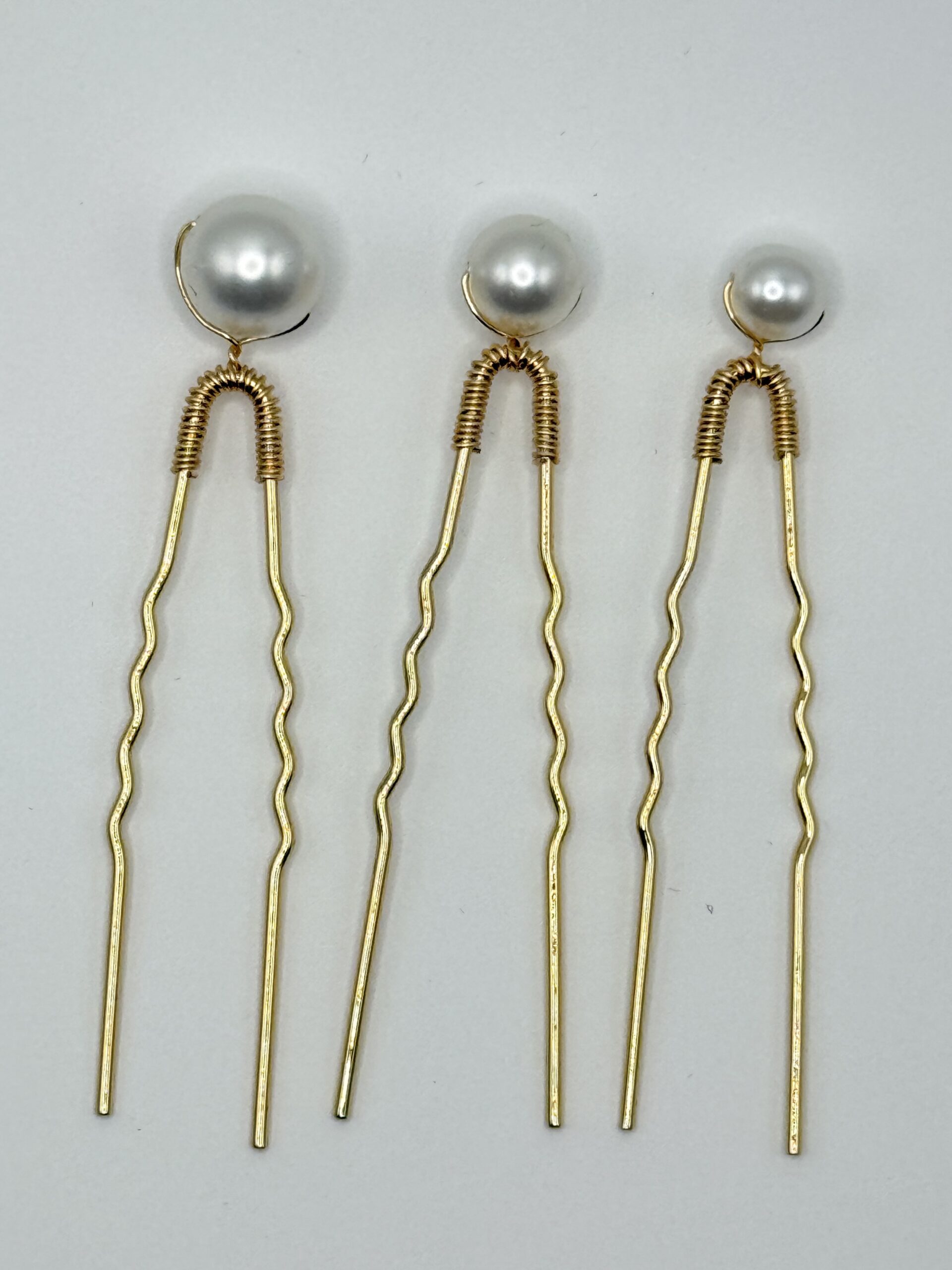 3PICS À CHEVEUX PERLÉA DORÉ , pics en laiton ornés de perles en verre de taille différentes montés sur fil de cuivre doré .
